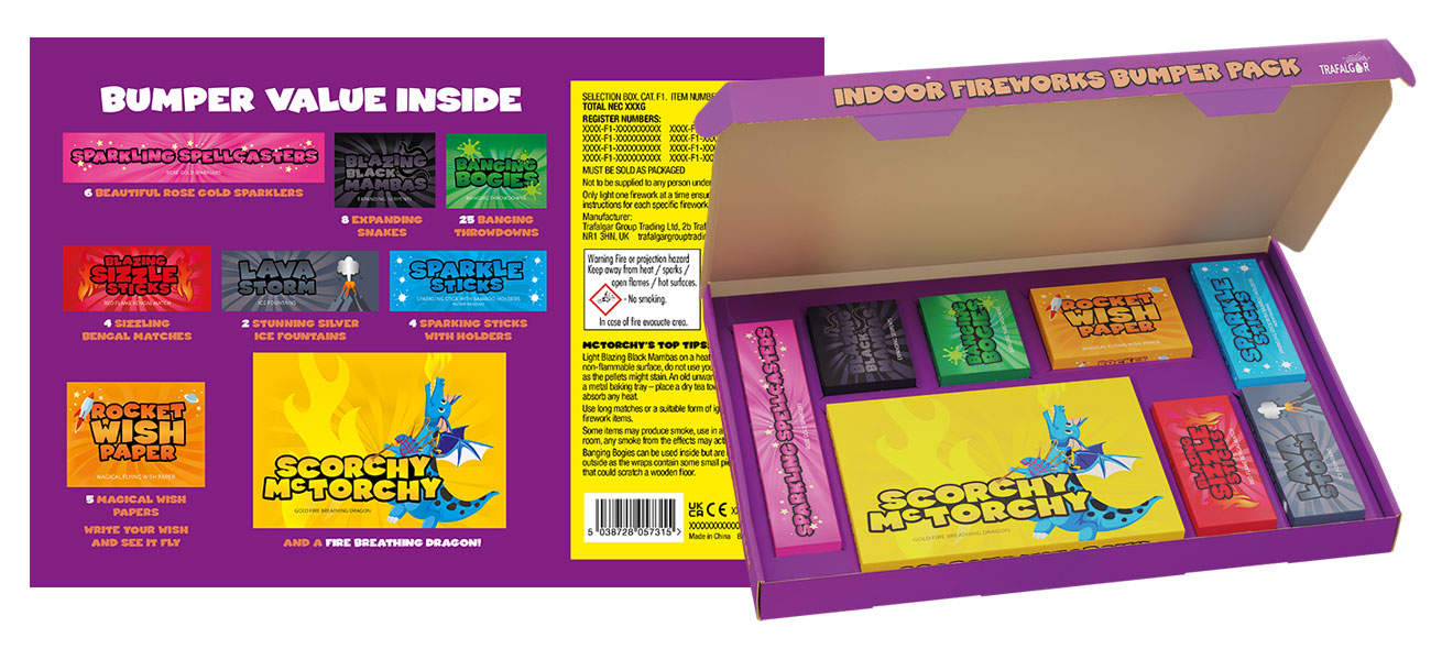 Now manufactured and shipped to the UK, the latest generation of this hugely popular product showcases this indoor fireworks packaging design project. Made in China for the UK based Trafalgar Group Trading, Indoor Fireworks have a long history of massive sales thanks to fond memories of gathering round the kitchen table and putting on a mini, indoor firework display.